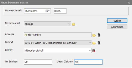 Fenster zur Erzeugung eines neuen Dokumentes
