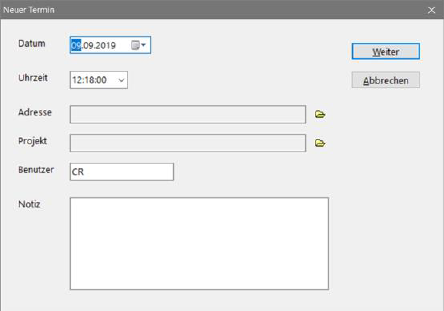 Haben Sie den Schalter neuer Termin betätigt, wird ein Fenster aufgezogen, in dem Sie das Datum des Termins mit der Uhrzeit eintragen können. Wählen Sie über den Schalter Adresse laden eine Anschrift aus der Adressdatenbank und über den Schalter Projekt laden ein Projekt aus der Projekttabelle aus. Die Felder Benutzer und Notiz dienen der Beschreibung des Termins.
