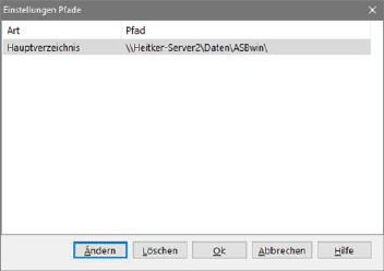 Der Schalter Ändern ruft einen Verzeichnisauswahl-Dialog auf und ändert den ausgewählten Pfadeintrag. Der Schalter Löschen löscht den ausgewählten Pfadeintrag, also setzt diesen wieder auf den Standardwert zurück. Der Schalter Ok übernimmt die Einträge. Die Module von ASBwin müssen neu gestartet werden, um die neuen Einstellungen zur Kenntnis zu nehmen. Der Schalter Abbrechen schließt den Dialog, ohne Änderungen abzuspeichern. Die Änderung der Pfade ist nur nötig, wenn die Datenbank auf einem Server installiert ist, die Anwendungsdateien aber lokal installiert werden, um z. B. den Programmstart zu beschleunigen oder den Netzverkehr zu verringern. Liegt das Programm selber auf einem Server, sollten die Einträge leer sein. Leere Einträge bedeuten, dass die Standardeinstellungen benutzt werden. Einträge verändern das Standardverhalten.