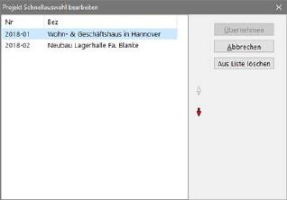 Um die Schnellauswahl zu bearbeiten, wählen Sie die Windowsmenüfunktion Datei/ Schnellauswahlliste bearbeiten. Hier können Sie auch Projekte aus dieser Liste entfernen. Sie finden diese dann nach wie vor in der normalen Projektauswahlliste.