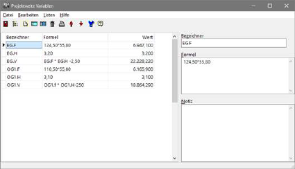 Das Feld Formel verhält sich analog zur Mengenermittlung. Es stehen auch hier alle Funktionen der Mengenermittlung zur Verfügung. Auf vorhergehende lokale oder globale Variablen kann innerhalb der Formel Bezug genommen werden. Globale Variablen sind in der Mengenermittlung nur sichtbar, wenn dieses Feld einen Wert enthält.