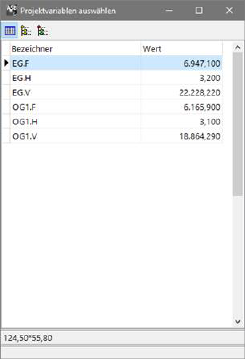 Der Aufruf projektweiter Variablen geschieht aus dem Mengenregister im Modul Ausschreibung. Betätigen Sie hierfür den Schalter Projektvariable auswählen. In dem daraufhin erscheinenden Fenster können Sie eine Anzeige in Tabellen- oder Explorerform über die Schalterleiste wählen. Bei der Explorer- Darstellung wird zusätzlich eine inverse Darstellung angeboten. um z. B. Räume nach Flächen sortiert anzuzeigen. Mit einem Doppelklick wird die globale Variable in die aktuelle Mengenermittlung der Position übernommen. Für eine schnelle Bearbeitung von größeren Mengenlisten können Sie beim Durchlaufen der Liste auch mit der Taste q eine Übernahme durchführen.
