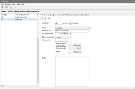 Im Modul Bauregie verwalten Sie Aufträge, Nachträge, Rechnungen und Kostenbudgets. Nach Aufruf erscheint im linken Fenster die Projektauswahl. Nach Anklicken eines Projektes sehen Sie die zugehörigen Auftragnehmer in der Auswahlliste. In den Registern auf der rechten Seite werden die Auftragsdaten angezeigt.