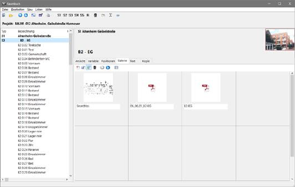 Im Register Galerie können Sie Dokumente unterschiedlichster Art zu einem Raum oder einer Gliederungsstruktur ablegen. Bildformate mit den Endungen *.png, *.bmp, *.jpg, *.gif, *.wmf, *.emf, werden direkt angezeigt, die übrigen Formate wie z.B. *.pdf können mit Doppelklick auf das Symbol mit der verknüpften Software unter Windows gestartet werden. Fügen Sie neue Bilder mittels Windows- Zwischenablage ein (Kopieren und Einfügen mit der rechten Maustaste) oder wählen Sie den Schalter Dokument/Grafik laden, mit dem Sie einen Dateiauswahldialog öffnen.