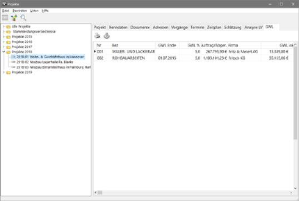Zur Überwachung von Gewährleistungsfristen klicken Sie auf dieses Register. Es zeigt zum ausgewählten Projekt alle in der Bauregie vereinbarten Gewährleistungen übersichtlich in einer Tabelle. Mit dem Schalter Einstellungen auf diesem Register können Sie bestimmen, ab welcher Frist die Einträge farblich hervorgehoben werden sollen.