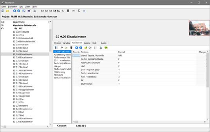 Im Register Positionen können sie einzelnen Räumen Leistungen aus dem Leistungsverzeichnis zuordnen und so u.a. eine raumbezogene Mengenermittlung durchführen. Zur besseren Übersicht wurden hier sogenannte Positionsgruppen oder Kategorien eingeführt, in welchen einzelne Leistungen zusammengefasst werden können.