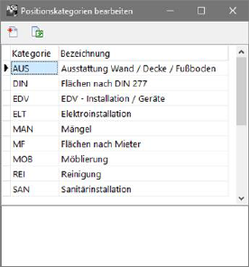 Mit dem Schalter Positionskategorien erfassen im Kopf des Registerblattes wird ein Fenster zur Bearbeitung der Kategorien geöffnet. Diese dienen der besseren Sortierung nach Inhalten. Sie zeigen die Verknüpfungen zu Positionen im Leistungsverzeichnis an. Benennen Sie die Kategorie mit einem eindeutigen Kürzel und geben Sie eine Bezeichnung oder Beschreibung zu dieser Kategorie an. Sie können ein allgemein übliches Muster an Kategorien für Ihr Büro festlegen und dies als Projektvorlage für zukünftige Projekte bestimmen. Bei Neuanlage eines Projektes werden Sie dann diese Kategorien jedes Mal vorfinden und können diese für das Projekt anpassen.