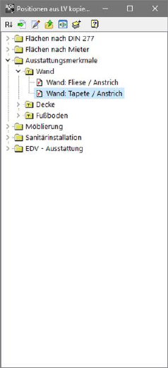 Bei der Übernahme von Positionen wird nach einem Parameter für die Mengenermittlung gefragt. Geben Sie hier die zuvor erfassten Variablen des Raumes ein. Sie können aber auch direkt eine Zahl eingeben um z.B. die Zahl der Heizkörper einzutragen. Handelt es sich um die Position Wandanstrich, könnte hier die Variable WFL für Wandfläche stehen. ASBwin wird später bei der Mengenermittlung für diese Positionen automatisch die Wandflächen aller verknüpften Räume annehmen. Weitere Schalter in dem Fenster Positionen aus LV kopieren dienen dem schnellen Wechsel zwischen einzelnen Räumen oder der Übernahme kompletter Ausstattungen zwischen zwei identischen Räumen. Die Bedeutung der einzelnen Schalter wird angezeigt, wenn Sie den Mauszeiger kurz auf diesen ruhen lassen.