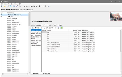 Mit dem Schalter Positionen aus LV kopieren öffnen Sie das Leistungsverzeichnis des aktuellen Projektes, um einzelne Leistungspositionen mit dem Raum zu verknüpfen. Sie müssen Positionen, die Sie verknüpfen wollen, vorher in dem Ausschreibungsmodul anlegen. Mit dem Schalter Ausschreibung öffnen können Sie das Leistungsverzeichnis dieses Projektes direkt öffnen, um z.B. neue Positionen zu erfassen. Die Verknüpfung muss nicht unbedingt auf Ausschreibungspositionen verweisen. Es können hier auch Verzeichnisse mit sogenannten Grobpositionen oder Mängelverzeichnisse geführt werden. Neben Einrichtungsverzeichnissen wären auch Mitarbeiter- oder Schlüsselverzeichnisse denkbar. Erstellen Sie im Ausschreibungsmodul einfach eine Liste von Elementen oder Positionen, die Sie später mit Räumen verknüpfen wollen. Die Mengenermittlung für einzelne Positionen wie z.B. Wandanstrich, ist nur eine von vielen Anwendungsmöglichkeiten.