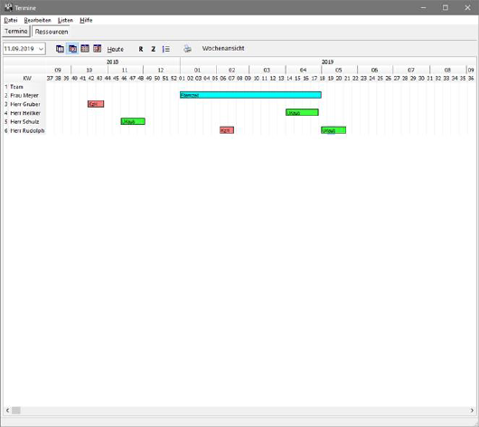 In der Terminverwaltung können Sie auf das zweite Register wechseln, um die Ressourcenverwaltung zu erreichen. Alle hier verfügbaren Funktionen wurden bereits im Kapitel Projektverwaltung beschrieben. Es handelt sich in der Tat um die gleiche Ressourcenverwaltung. Mit dem einzigen Unterschied, dass hier keine projektbezogenen Daten verwaltet werden. Diese Datensicht ist z. B. für eine bürointerne Urlaubsverwaltung oder als Balkenplan für die "Planung der Planung" geeignet. Weisen Sie Ihren Mitarbeitern beispielsweise Ressourcen zu, um diese dann auf die einzelnen Projekte und Planungsphasen zu verteilen.