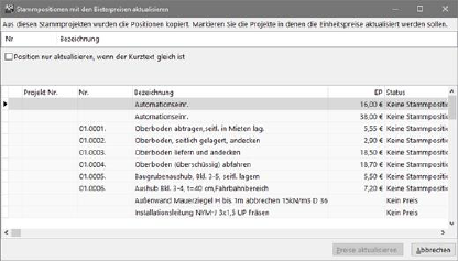Wenn Sie mit Stammleistungsverzeichnissen arbeiten, in denen Sie immer wieder benutzte Positionen für die Kostenschätzung vorhalten, können Sie mit dieser Funktion aktuelle Preise eines Bieters an die Stammpositionen übergeben. ASBwin bietet zwar auch die Möglichkeit, Bieterpreise ins Leistungsverzeichnis einzuspielen, aber in dem Fall wird die ursprüngliche Position aus dem Stamm- LV nicht aktualisiert.