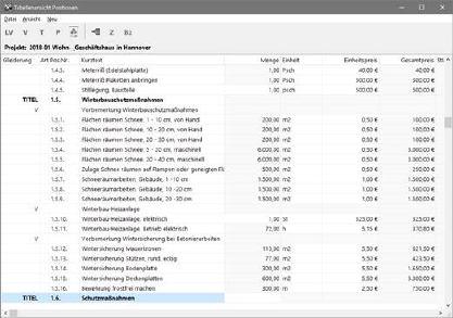 Die tabellarische Erfassung ist u. a. sinnvoll, wenn Sie schnell Positionen oder Mengen in Folge erfassen wollen. Sie finden Schalter für neue Positionen oder Gliederungsstufen unterhalb der Menüleiste. Weitere Möglichkeiten bietet der Menüpunkt "Neu" in der Menüleiste.