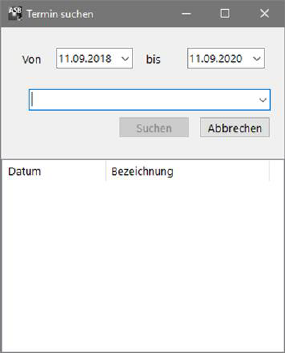 Über den Windowsmenübefehl Bearbeiten - Suchen oder die Kurztaste F3 erreichen Sie die Suchfunktion der Terminverwaltung. Grenzen Sie gegebenenfalls den zu durchsuchenden Zeitraum ein und geben Sie anschließend einen Suchbegriff ein. In der Trefferliste finden Sie alle gefundenen Termine, in deren Kurztext der Begriff vorkommt. Klicken Sie auf eine Trefferzeile, um im Terminkalender das entsprechende Datum anzeigen zu lassen.