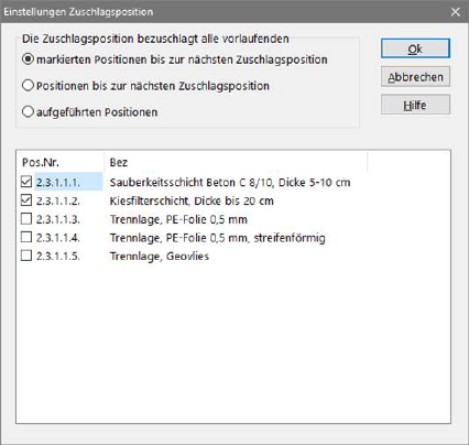 1. Alle markierten, vorangehenden Positionen werden bezuschlagt. Die Bezuschlagung endet bei einer vorangehenden Zuschlagsposition. Direkt hintereinander liegende Zuschlagspositionen bezuschlagen allerdings die gleichen Positionen.